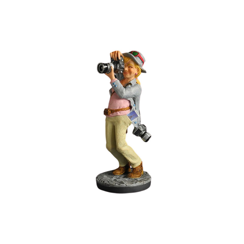Cette figurine Photographe de 19 cm de hauteur est une création des artistes caricaturaux néerlandais Fons van Dommelen et Ed van Rosmalen. Ici les deux artistes mettent en avant l'univers du photographe et retransmettent la passion de ce métier tout en appuyant sur les stéréotypes de la photographie amateur avec les lunettes de soleil, le plan de Paris ainsi que la banane.