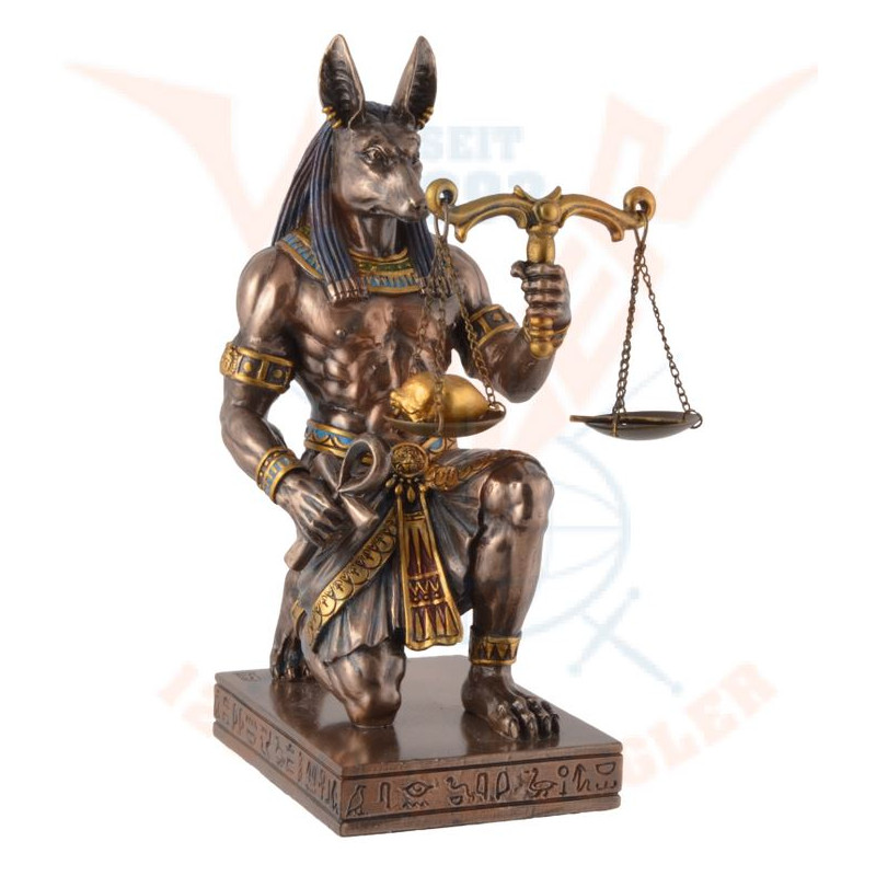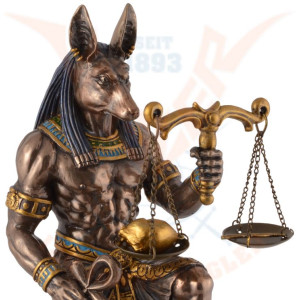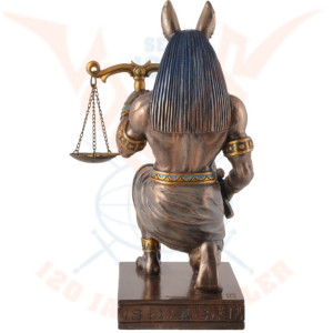 Il est représenté avec une tête de chien et un corps d'homme. Il est orné d'une tenue égyptienne avec des tons dorés et bleus. Il tient dans sa main gauche une balance avec un cœur à l'intérieur. Anubis avait pour mission de peser le cœur des défunts et de dicter leur destin. Le cœur de chaque défunt était posé sur une balance sur laquelle se trouvait d'autre part une plume. Cette plume représentait la vérité.
