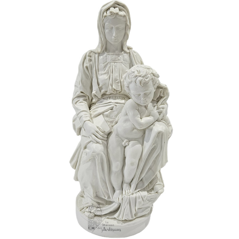 Reproduction fidèle de la sculpture "La madone de Bruges" réalisée entre 1501 et 1504 par Michel-Ange. C'est la seule sculpture de l'artiste qui a quitté l'Italie de son vivant. La sculpture représente la Vierge Marie et son enfant Jésus.