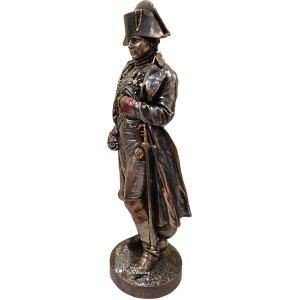 Statuette patinée bronze remarquablement détaillée représentant Napoléon Bonaparte. Il porte le chapeau-bicorne et son uniforme préféré avec la veste de colonel de chasseur à cheval de la Garde. Par dessus, il porte un long manteau officier ouvert. Il tient une longue-vue dans sa main droite.