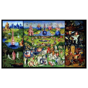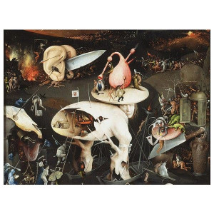 Personnage extrait du triptyque de Bosch "Le Jardin des Délices", beaucoup voient un autoportrait de Bosch dans l’une de ses créatures hybrides les plus célèbres. Le creux du corps ovale abrite un café. La cornemuse sur le couvre-chef évoque l’immoralité dans laquelle pourraient nous plonger la musique et la danse. Dans ce tryptique, Jérôme Bosch commente la vie de débauche que nous menons, nous les mortels issus du paradis terrestre, et qui nous conduit droit aux affres de l’enfer. Jérôme Bosch est considéré comme le précurseur du surréalisme, célèbre pour ses motifs fantastiques dans un monde hostile débordant de mystique moyenâgeuse.
