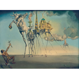 Dans cette œuvre de Dalí, une scène à la fois fascinante et inquiétante se déploie. Au centre, on trouve la figure de saint Antoine, un ermite chrétien, agenouillé dans une profonde concentration, brandissant sa croix face à une menaçante procession d'apparitions surréalistes. Chaque élément est choisi avec soin, comme un écho du combat qui ne se joue pas à l’extérieur, mais au plus profond de l’âme du saint.