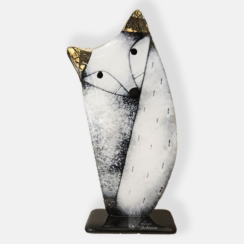 Une statuette représentant un renard polaire stylisé, entièrement réalisée à la main par les maîtres verriers d'art. Existe aussi en taille S et M (liens plus bas), pour une jolie association.