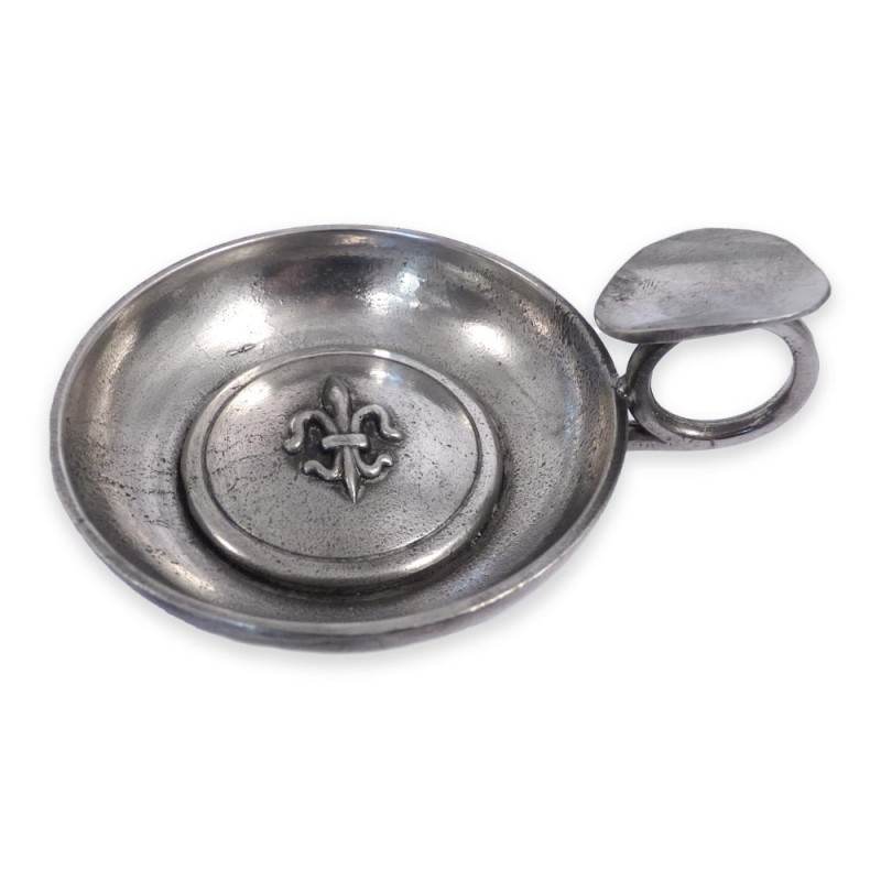 Cette tasse de dégustation ou tâte-vin en étain décorée d'une fleur de lys vous permettra d'examiner vos vins, de les mirer, de les sentir et de les goûter.