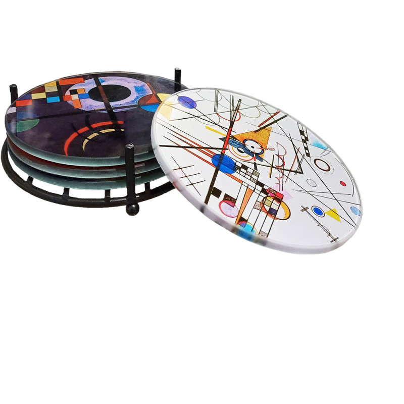 Cet ensemble comprend quatre dessous de verres sur le thème de l'artiste Kandinsky.