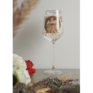 Ce verre à vin réalisé par l’atelier d'art Goebel est une adaptation d’une œuvre d'Alphonse Mucha. Il fait partie de la Collection Artis Orbis qui décline de grands tableaux de l’histoire de l’Art en objets décoratifs d’exception à travers lesquels Art et artisanat se marient à merveille.