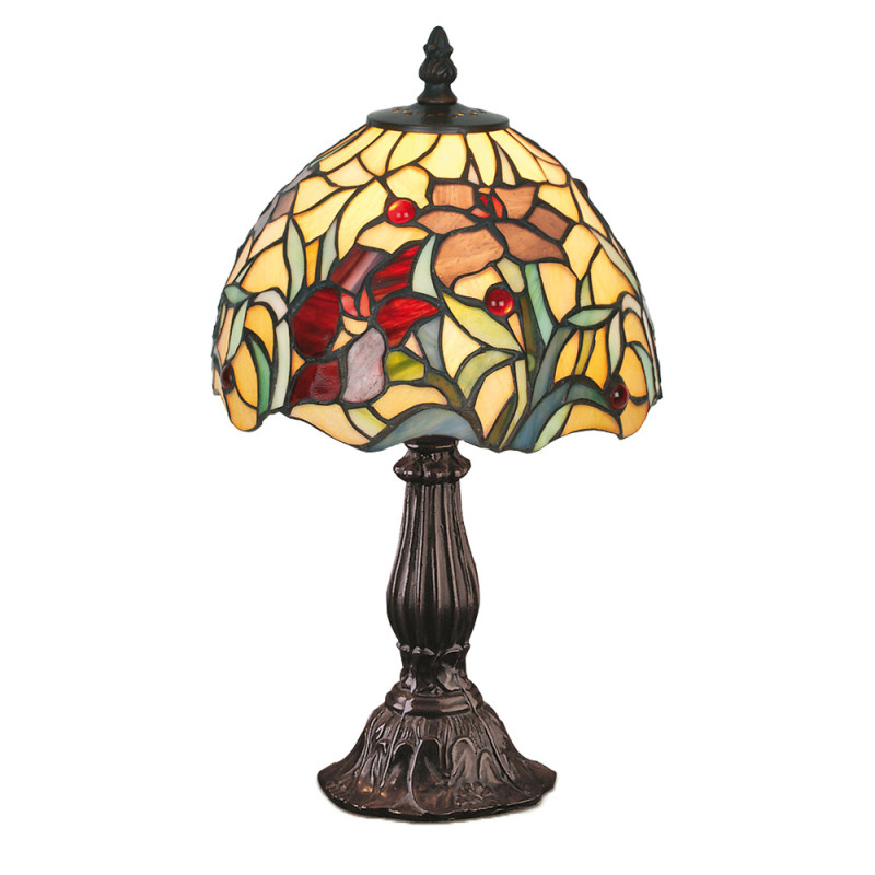 Son abat-jour est composé de pièces en verre formant des motifs floraux et végétaux, agrémentés de perles rouge bourgogne.