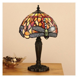 Cette petite lampe Tiffany fait partie de la collection Dragonfly (Libellule). Ce décor est un classique des motifs Tiffany traditionnels au style Art Nouveau, ici en couleurs vibrantes d'oranges et de rouges.