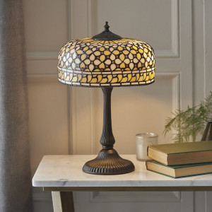 Chacune de nos lampes Tiffany est fabriquée à la main avec des matériaux de très haute qualité uniquement. Le verre lui-même est fabriqué manuellement par l'artisan qui fond ses propres mélanges de verres colorés. L'utilisation de cette technique traditionnelle assure que chaque pièce de verre est unique grâce aux multiples variations de couleurs et de textures qui naissent pendant la fusion. Les décors des lampes contiennent des centaines de ces morceaux de verre individuels qui formeront un motif parfait. Pour couper, souder puis apporter les finitions nécessaires, chaque abat-jour demande de nombreuses heures de travail à des artisans hautement qualifiés. Mais l'excellence à la fois du savoir-faire des verriers et des matériaux utilisés est la garantie que chaque lampe Tiffany est d'une qualité à la hauteur de la légende.