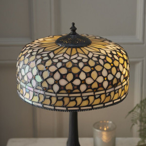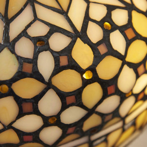 Cette lampe Tiffany est une conception exclusive de l'atelier de verrerie d'art. Comme son nom français l’indique, la collection "Mille feux" utilise d’innombrables pièces de verre comme autant de sources de lumières distinctes. Celles-ci y forment un modèle géométrique à la fois riche et flamboyant grâce à la minutie du décor incrusté de perles de verre, et subtil par ses teintes crèmes.
