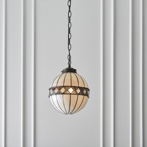 Le décor de ce plafonnier lanterne combine des formes Art Deco avec des éléments de style plus contemporains. Le contraste élégant d'un noir irisé avec un fond crème nacré renforce son aspect moderne. Il s'accorde donc parfaitement avec des environnements tant classiques que modernes.