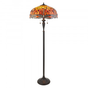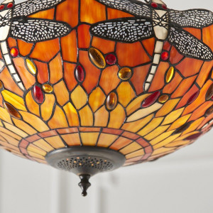 Ce plafonnier Tiffany fait partie de la collection Dragonfly (Libellule). Ce décor est un classique des motifs Tiffany traditionnels au style Art Nouveau, ici en couleurs vibrantes d'oranges et de rouges.