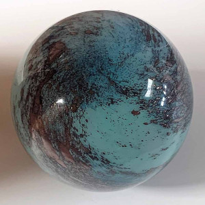 Lampe en verre soufflé bouche, de forme ovale, nommée "Planète", dans les tons bleus / mouchetés marron.