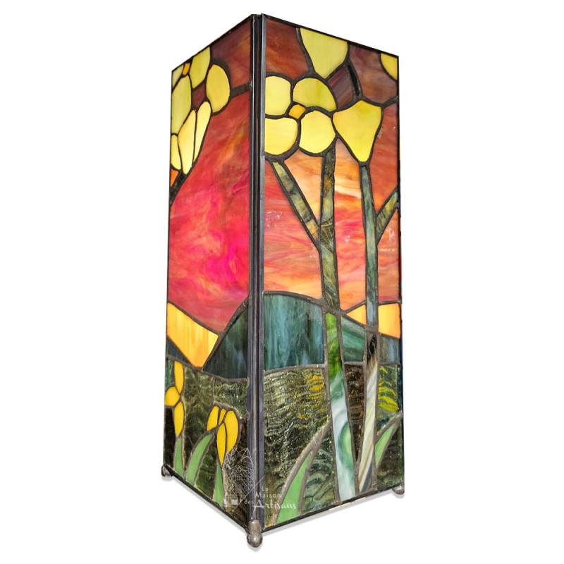 Cette lampe originale façon vitrail réalisée en pâte de verre contribuera à créer un intérieur chaleureux. Elle présente des motifs de fleurs, dans un décor où les collines vertes contrastent avec le ciel aux couleurs chaudes.