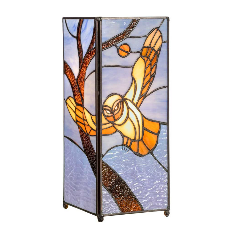 Cette lampe originale façon vitrail, réalisée en pâte de verre, présente une chouette aux ailes déployées s'élançant dans la nuit à la lueur de la lune.