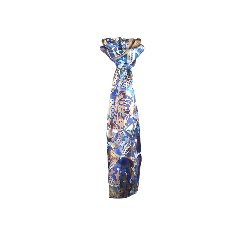 Cette étole en soie et bandes de satin dans les tons oranges et violets s'inspire d'une mosaïque de Gaudí.