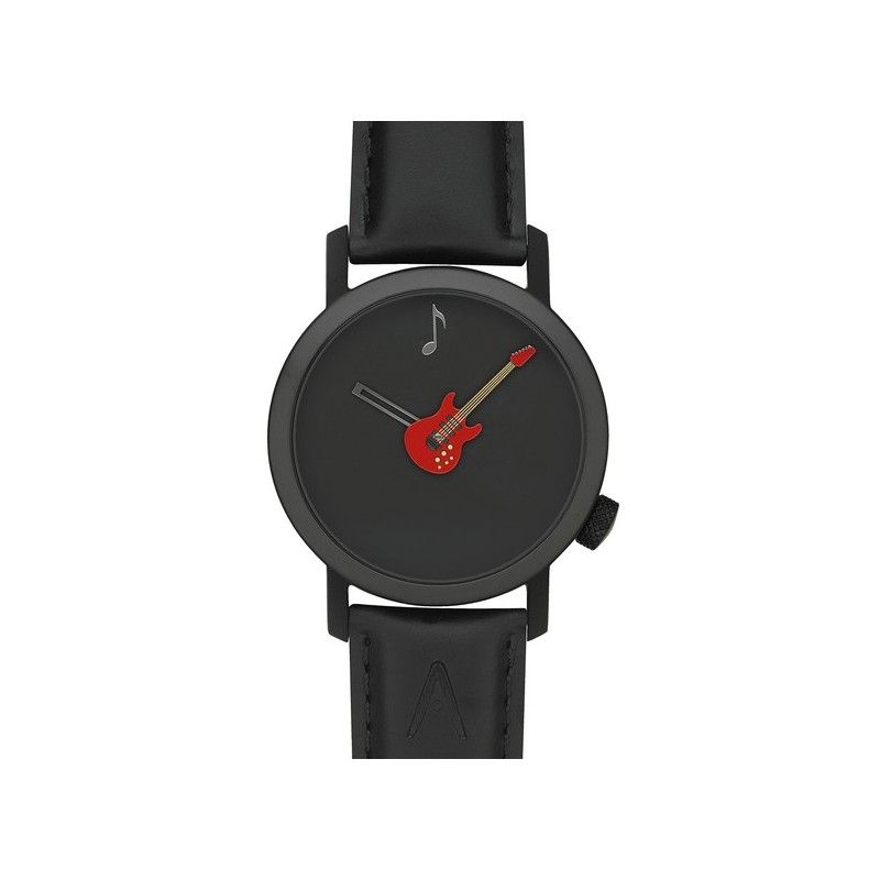 Cette montre au bracelet et au cadran noirs, contrastés par une guitare électrique rouge, charmera tous les guitaristes et amateurs de musique.