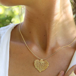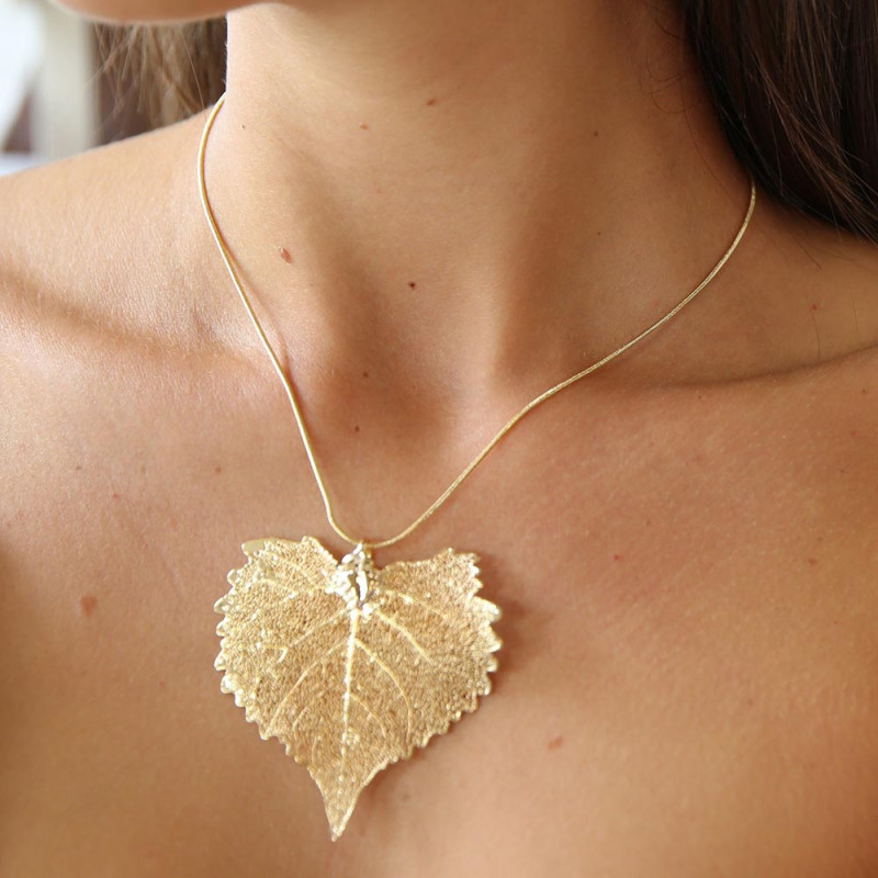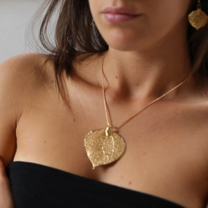 La Nature vous offre cette feuille d'une grande finesse, d'abord recouverte par deux couches de cuivre puis trempée dans un bain d'or rose, d'or fin 1000 millièmes ou d'argent rhodié. Une chaîne réglable de 40 à 45 cm accompagne le pendentif.
