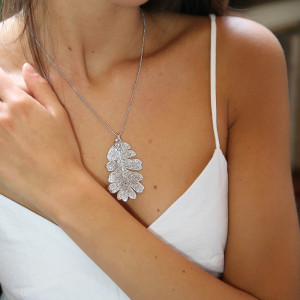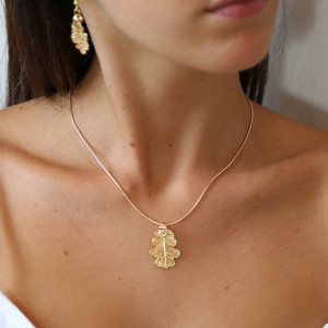La Nature vous offre cette feuille d'une grande finesse, d'abord recouverte par deux couches de cuivre puis trempée dans un bain d'or rose, d'or fin 1000 millièmes ou d'argent rhodié. Une chaîne réglable de 40 à 45 cm accompagne le pendentif.
