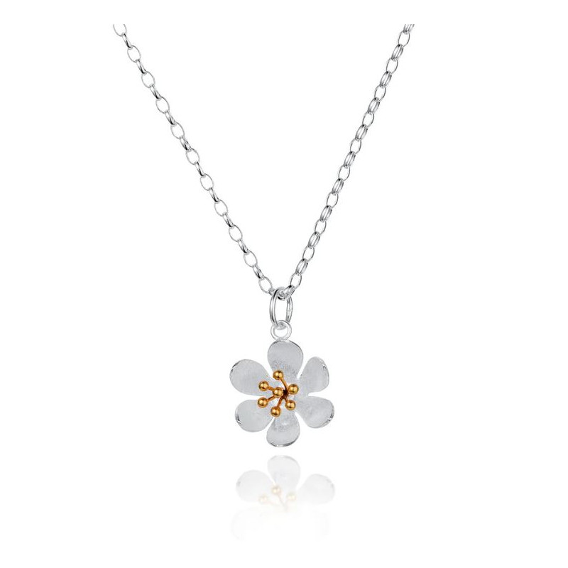 Un collier délicat, dont le pendentif représente une petite marguerite en argent massif satiné, aux détails plaqués or 18 carats.