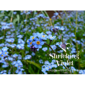 "Tout commence à la fin des années 90, dans un champ au festival de Glastonbury (Angleterre). Après une nuit de danse intense, nous admirons le lever du soleil sur le site. Une expérience vraiment magique. Puis nous repérons une pâquerette solitaire qui se distingue des pâturages verts, et l'idée nous vient de capturer ces merveilles naturelles afin de créer de magnifiques bijoux. Les bijoux Shrieking Violet sont fabriqués à la main avec de l'argent et de toutes petites fleurs qui sont encapsulées dans de la résine. Notre jardinier en chef surveille attentivement les fleurs et les soigne avec amour (et de l'eau) jusqu'à ce qu'elles atteignent la taille parfaite. Elles sont ensuite soigneusement cueillies, conservées et associées dans de belles créations à porter en bijoux."