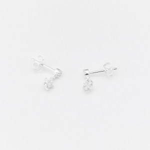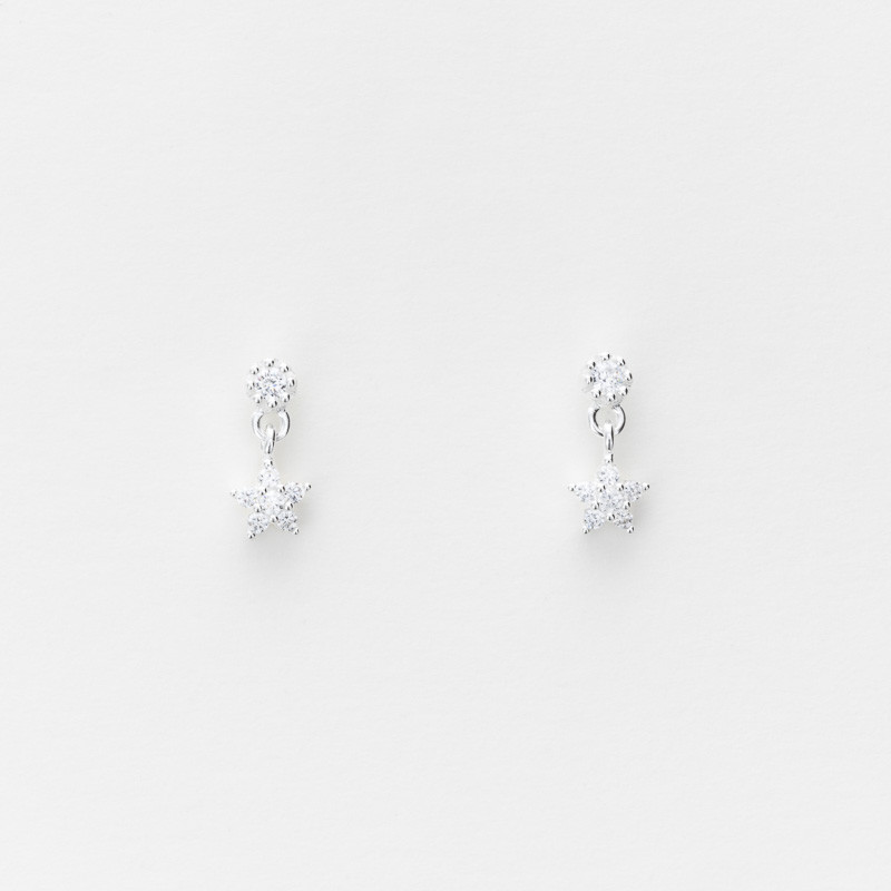 Boucles d'oreilles en argent: clous ronds ornés d'oxydes blancs et leurs petites breloques pendantes en forme d'étoile.