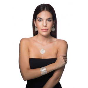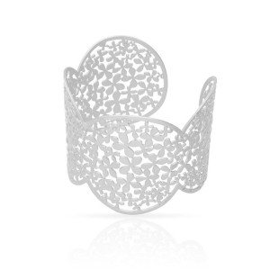 Bracelet manchette de couleur argentée. Ce bijou tire son inspiration de la nature et plus particulièrement de la fleur d'hortensia.