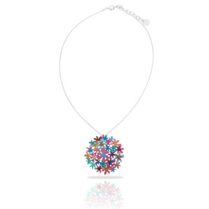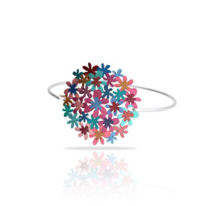 Broche fibule en forme de bouquet de fleurs. Elle s'inspire de fleurs prélevées dans la forêt, avec une palette de couleurs orientée vers le turquoise et le rose.