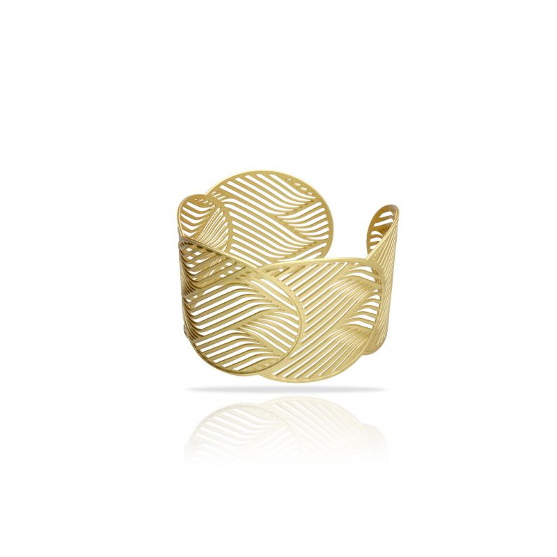 Manchette "Duna" de couleur dorée. Le bracelet tire son inspiration des mouvements naturels d'une dune de sable, et sa surface évoque des ondulations semblables à des vagues.