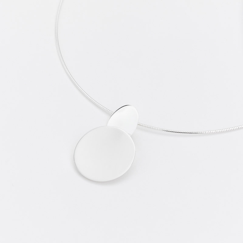Un collier fin et discret, composé d'une chaîne type câble décorée d'un pendentif à deux disques en argent massif.