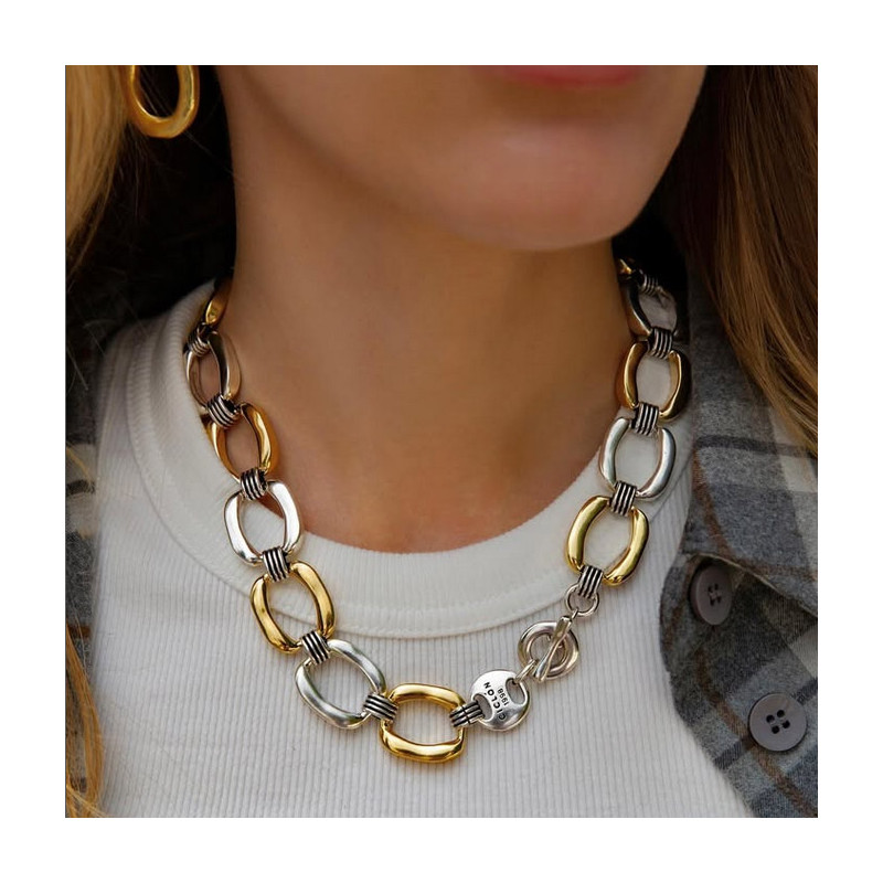Le collier Greta offre un design tendance grâce à ses anneaux géométriques épais. Il est composé de 16 maillons rectangulaires de 20mm aux lignes lissées.