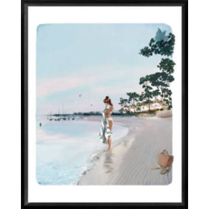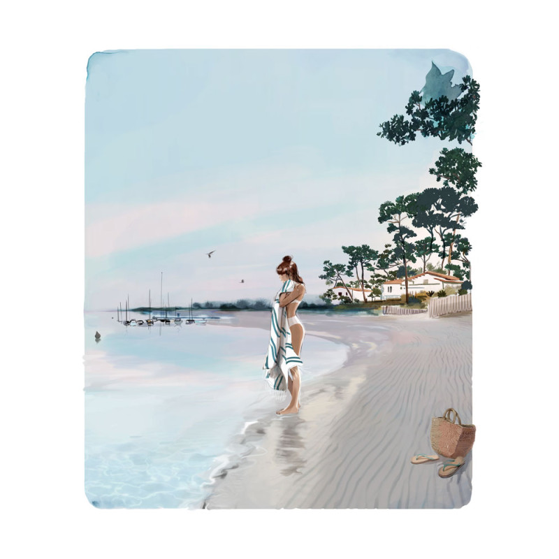 Une femme profite d'une dernière baignade dans l'océan. De profil, nous la voyons s'essuyer au soleil à l'aide de sa fouta à rayures vertes. Son joli sac en osier est posé au premier plan sur la plage. On reconnait tout à fait l'oeil aiguisé de Sophie Griotto pour les dernières tendances mode dans ce tableau. Au second plan, quelques bateaux et de jolis maisons sous les pins parasols complètent le charme de cette scène estivale.