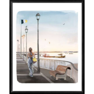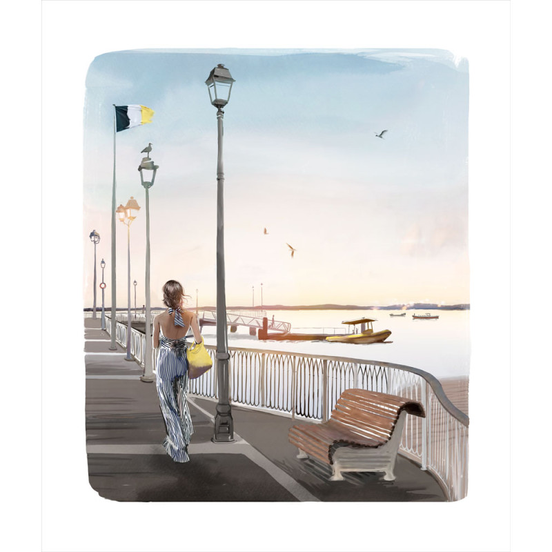 Située au cœur de la ville, la jetée Thiers est la plus connue d’Arcachon. Nous voyons dans ce tableau une femme de dos, portant un ensemble à rayures noires et blanches, ainsi qu'un sac jaune, faisant écho au drapeau flottant, aux couleurs du blason de la ville.