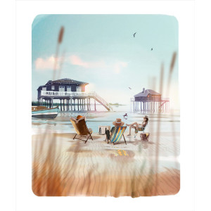 Ce tableau de Sophie Griotto est issu de la collection 2025. Il met en scène 3 personnages partageant un repas face à une cabane tchanquée typique du bassin d'Arcachon.