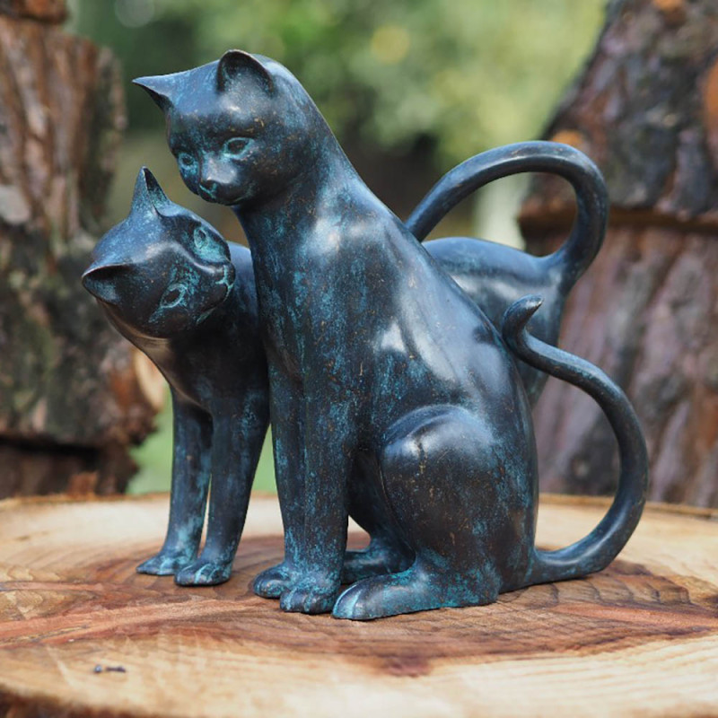 Élégante sculpture extérieure ou intérieure de hauteur 30 cm représentant deux chats complices, en bronze massif, réalisée par l'artiste flamand Ben Wouters.