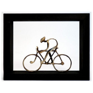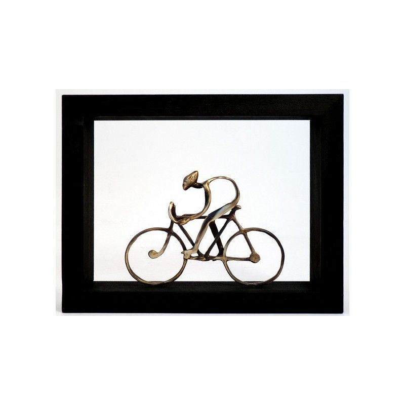 Cette sculpture en bronze entourée d'un cadre noir en bois, est une création unique et originale de l'artiste grec Georges Roumanas. Elle représente un cycliste sur son vélo, mains sur le guidon.