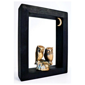 Cette sculpture en bronze entourée d'un cadre noir en bois, est une création unique et originale de l'artiste grec Georges Roumanas. Elle représente deux chouettes sur un arbre et sous la lune.