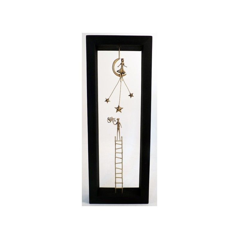 Cette sculpture en bronze entourée d'un cadre noir en bois, est une création unique et originale de l'artiste grec Georges Roumanas. Elle représente un homme qui s'élève à l'amour.