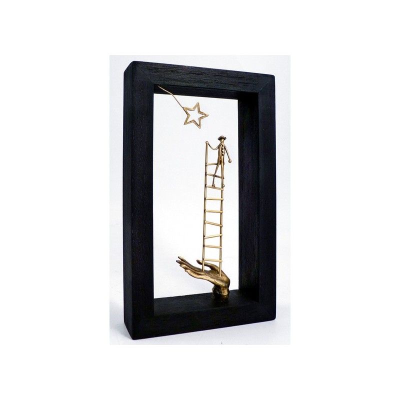 Cette sculpture en bronze entourée d'un cadre noir en bois, est une création unique et originale de l'artiste grec Georges Roumanas. Elle représente un homme sur une échelle portée par une grande main qui le rapproche d'une étoile.