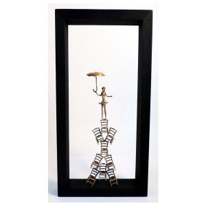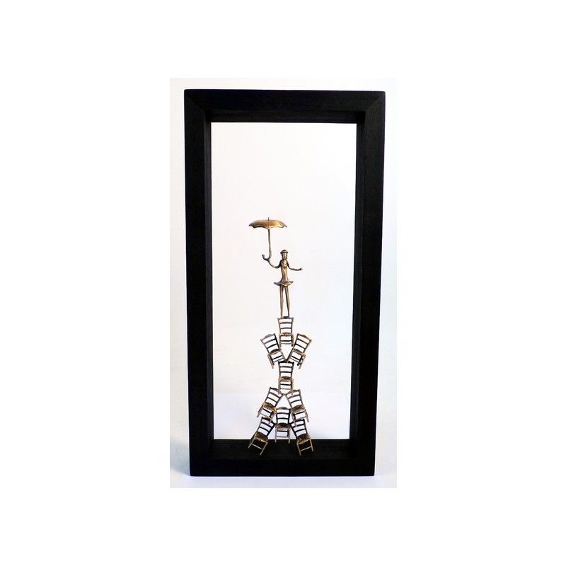 Cette sculpture en bronze entourée d'un cadre noir en bois, est une création unique et originale de l'artiste grec Georges Roumanas. Elle représente une femme tenant un parapluie, qui joue à l'acrobate sur une pile de chaises, symbolisant à la fois le courage et l'humour décalé.