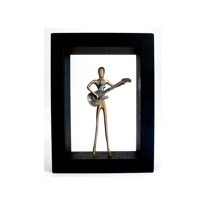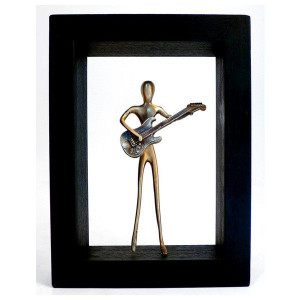 Cette sculpture en bronze entourée d'un cadre noir en bois, est une création unique et originale de l'artiste grec Georges Roumanas. Elle représente un guitariste jouant sur une guitare particulièrement splendide.