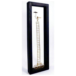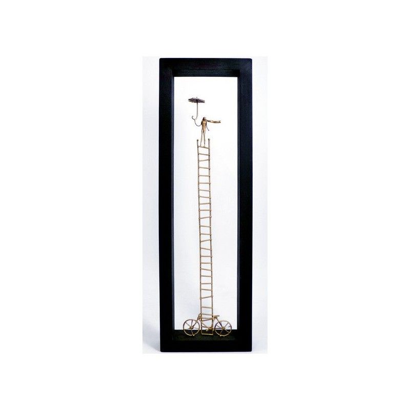 Cette sculpture en bronze entourée d'un cadre noir en bois, est une création unique et originale de l'artiste grec Georges Roumanas. Elle représente une grande échelle au pied de laquelle un vélo est appuyé, alors qu'au sommet se trouve une femme, écharpe au vent et parapluie à la main. L'univers poétique et romantique de ce sculpteur de talent accroche le regard et touche souvent en plein cœur.