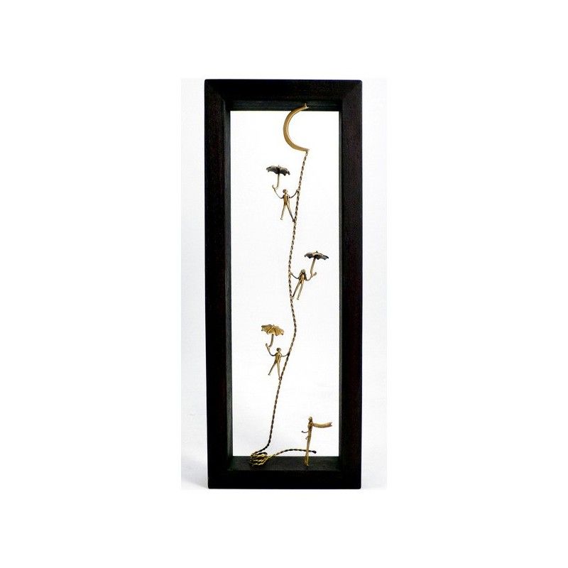 Cette sculpture en bronze entourée d'un cadre noir en bois, est une création unique et originale de l'artiste grec Georges Roumanas. Elle représente des personnages tenant une corde s'élançant jusqu'à la lune.