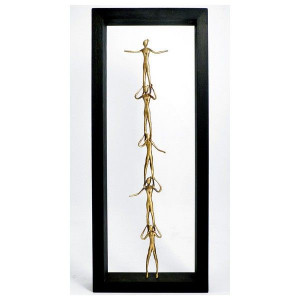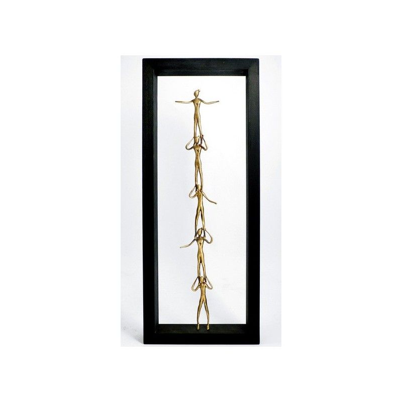 Cette sculpture en bronze entourée d'un cadre noir en bois, est une création unique et originale de l'artiste grec Georges Roumanas. Elle représente cinq personnes exécutant une pyramide humaine, prouesse d'équilibristes qui rappelle ces castells que l'on peut voir en Espagne.