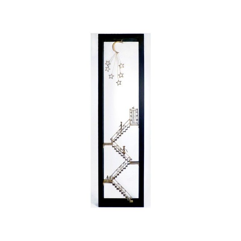 Cette sculpture en bronze entourée d'un cadre noir en bois, est une création unique et originale de l'artiste grec Georges Roumanas. Elle représente un escalier menant à une porte aérienne, sur lequel se trouvent deux enfants puis une femme puis un homme, toujours sous la lumière de la lune et de ses étoiles.