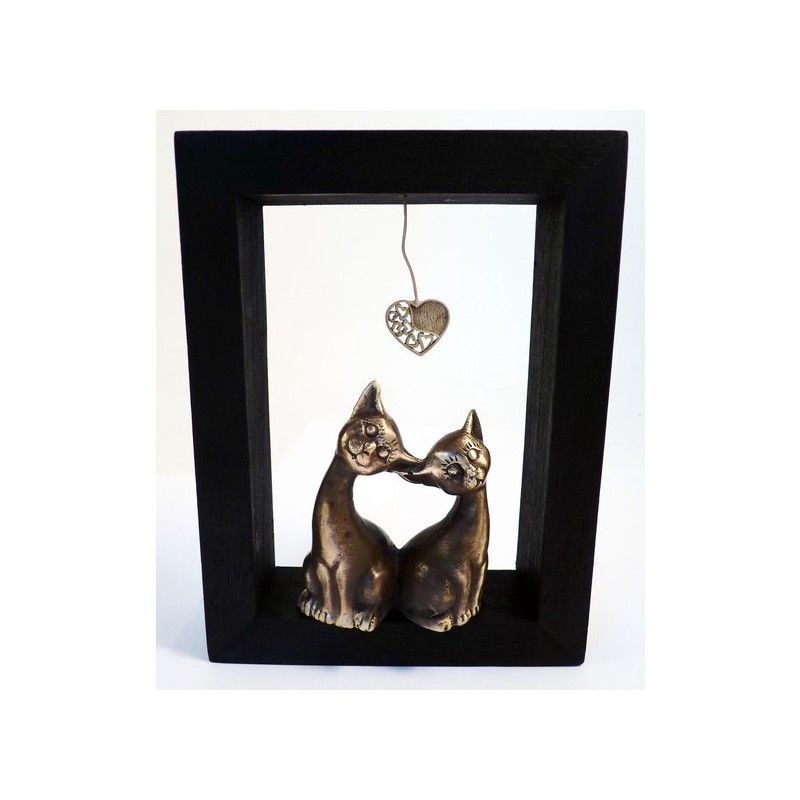 Cette sculpture en bronze entourée d'un cadre noir en bois, est une création unique et originale de l'artiste grec Georges Roumanas. Elle représente deux chats qui semblent liés d'une amitié fusionnelle.