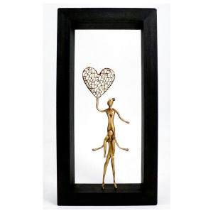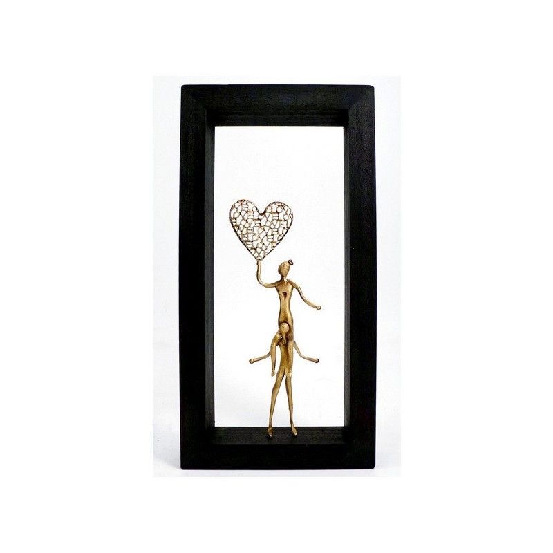 Cette sculpture en bronze entourée d'un cadre noir en bois, est une création unique et originale de l'artiste grec Georges Roumanas. Elle représente un homme portant une femme sur ses épaules alors que celle-ci tient un grand coeur dans sa main.