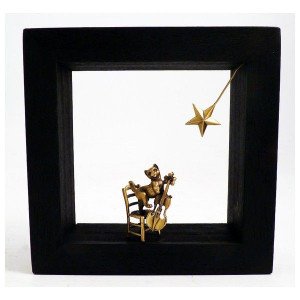 Cette sculpture en bronze entourée d'un cadre noir en bois, est une création unique et originale de l'artiste grec Georges Roumanas. Elle représente un chat jouant du violon sur sa chaise, sous une étoile.