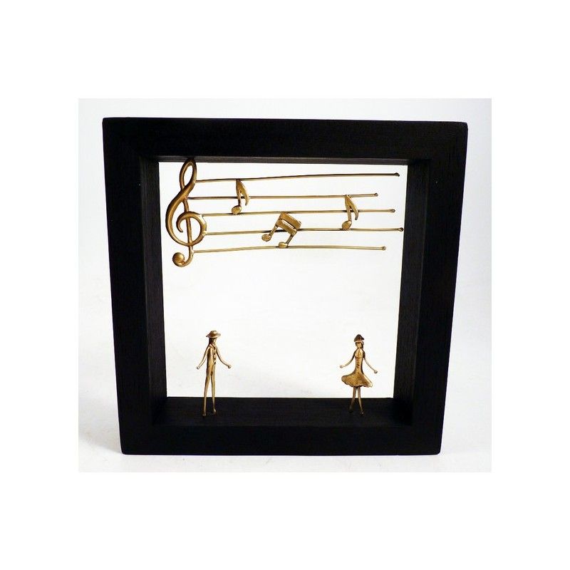 Cette sculpture en bronze entourée d'un cadre noir en bois, est une création unique et originale de l'artiste grec Georges Roumanas. Elle représente un couple passionné de musique.
