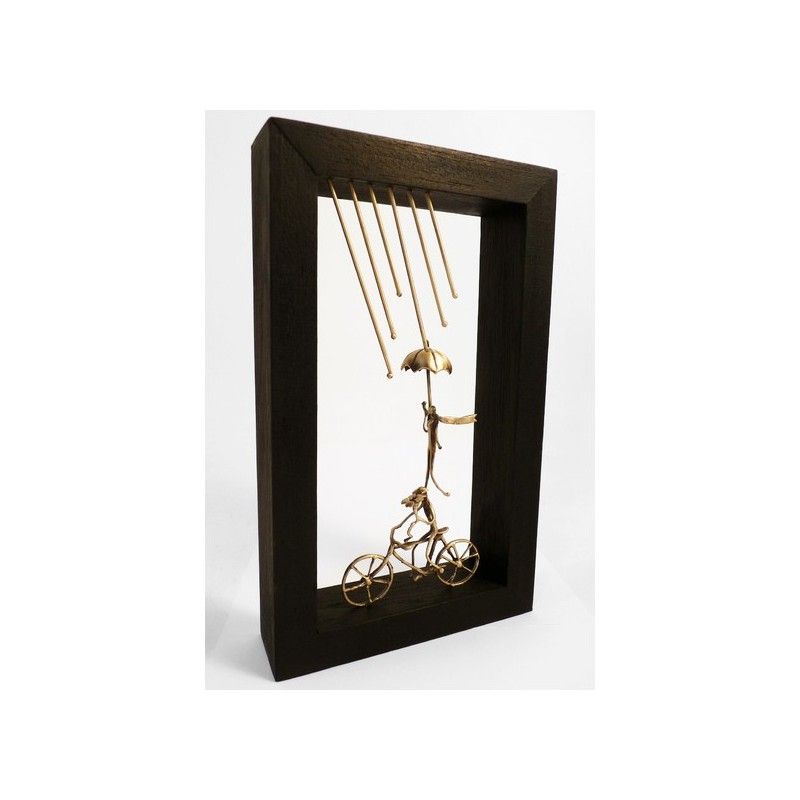 Cette sculpture en bronze entourée d'un cadre noir en bois, est une création unique et originale de l'artiste grec Georges Roumanas. Il représente un homme sur son vélo, tenant d'une main une fleur, et une femme jouant à l'acrobate, les protégeant tous les deux avec son parapluie.